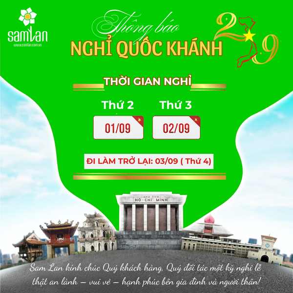 Nhân dịp 80 năm Quốc khánh 2/9, tập thể Công ty TNHH Sam Lan xin gửi lời kính chúc Quý khách hàng, Quý đối tác một kỳ nghỉ lễ thật an lành – vui vẻ – hạnh phúc bên gia đình và bạn bè.