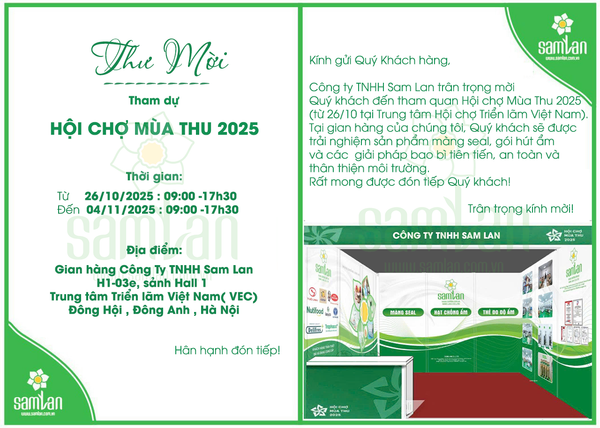 “Chúng tôi rất hân hạnh được chào đón Quý khách tại Hội chợ Mùa Thu 2025 – Gian hàng H1-03e. Hãy đến để cùng Sam Lan trải nghiệm sự khác biệt của công nghệ bao bì chống ẩm tiên tiến nhất hiện nay.”